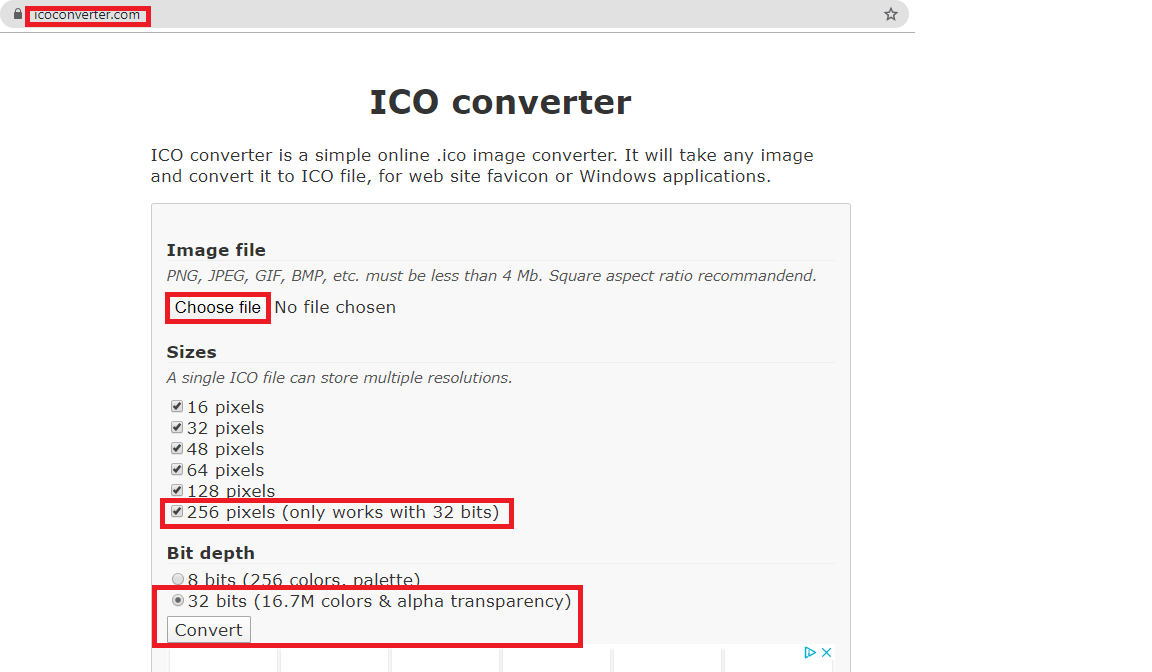 Choose your custom image, select all sizes (256 pixels is key), select 32 bits for bit depth and convert.